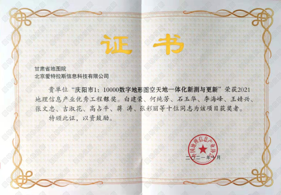 二零二一年十月,經(jīng)過(guò)中國地理信息產(chǎn)業(yè)協(xié)會(huì )嚴格評選,我公司參與項目《慶陽(yáng)市1:10000數字地形圖空天地一體化新測與更新》項目榮獲2021地理信息產(chǎn)業(yè)優(yōu)秀工程銀獎,我司總經(jīng)理為該項目獲獎?wù)咧弧?/span>