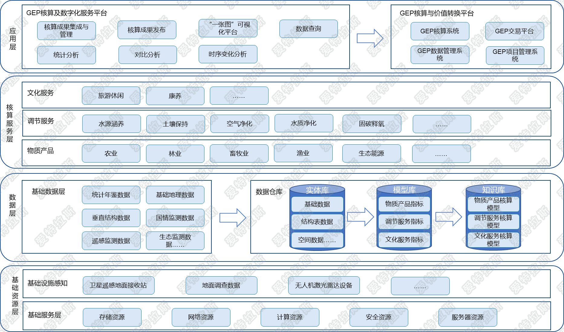 我司積極探索GEP核算的指標及相應核算標準,利用多源、多平臺遙感數據獲取水域、森林、大氣等生態(tài)系統的各項生態(tài)參數,結合地方政府的產(chǎn)業(yè)產(chǎn)值、旅游經(jīng)濟、氣象水文等多項統計數據,綜合考慮生態(tài)系統類(lèi)型、質(zhì)量、空間分布差異、地形因子等的影響,按照國家及行業(yè)地方GEP核算技術(shù)規范標準核算生態(tài)系統生產(chǎn)總值,分析不同行政區域、不同生態(tài)系統的生態(tài)系統生產(chǎn)總值空間分布特征;在此基礎上構建GEP動(dòng)態(tài)監測數字化服務(wù)平臺,打造集信息化、數字化、智能化、可視化、便捷化管理為一體的GEP核算及動(dòng)態(tài)監測數字化平臺。